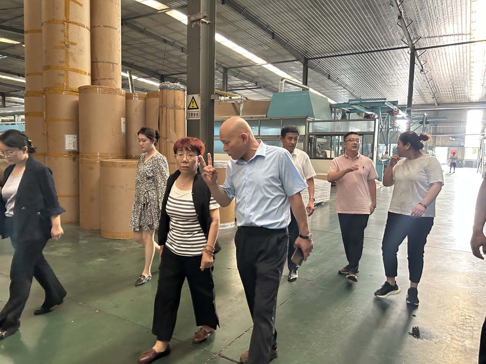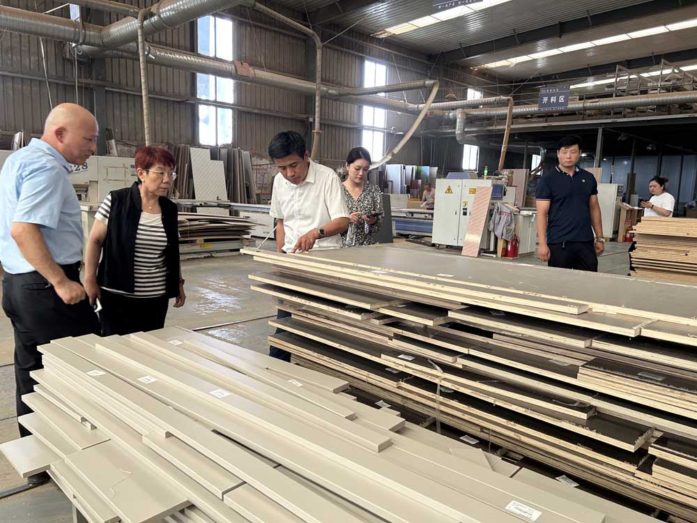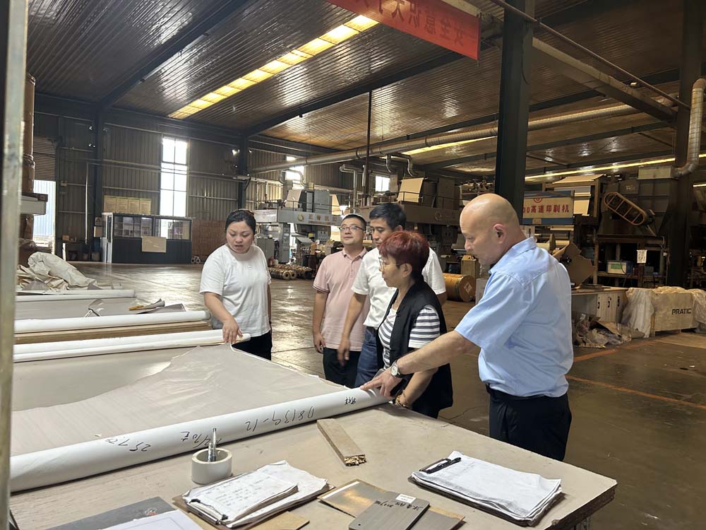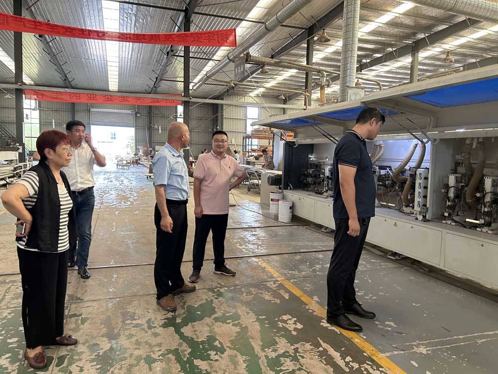 8月2日下午,山东省家具协会牛会长带队来到林峰新型装饰材料有限公司,对林峰旗下饰面纸、压贴、定制家具生产车间进行了参观调研。家具协会牛会长、韩会长、王会长及参观人员对厂房设备、包装运输、外贸渠道开拓进行了深入探讨。 公司负责人宋勇、郭丹首先向山东省家具协会的支持表示了感谢。柏维总经理宋勇提到,柏维家具公司计划进一步开拓外部市场,升级生产设备,提高产能,期待家具协会领导可以给出指导意见。欧赛总经理郭丹介绍了公司生产的印刷机械、浸胶智能流水线,以及压贴技术,她说道,我们林峰旗下产业链已经广泛应用于全国各地家具加工制造行业,随后,山东省家具协会向公司推荐了很多 合作单位,并表示愿意为林峰新型装饰公司的渠道拓展提供必要的协助。